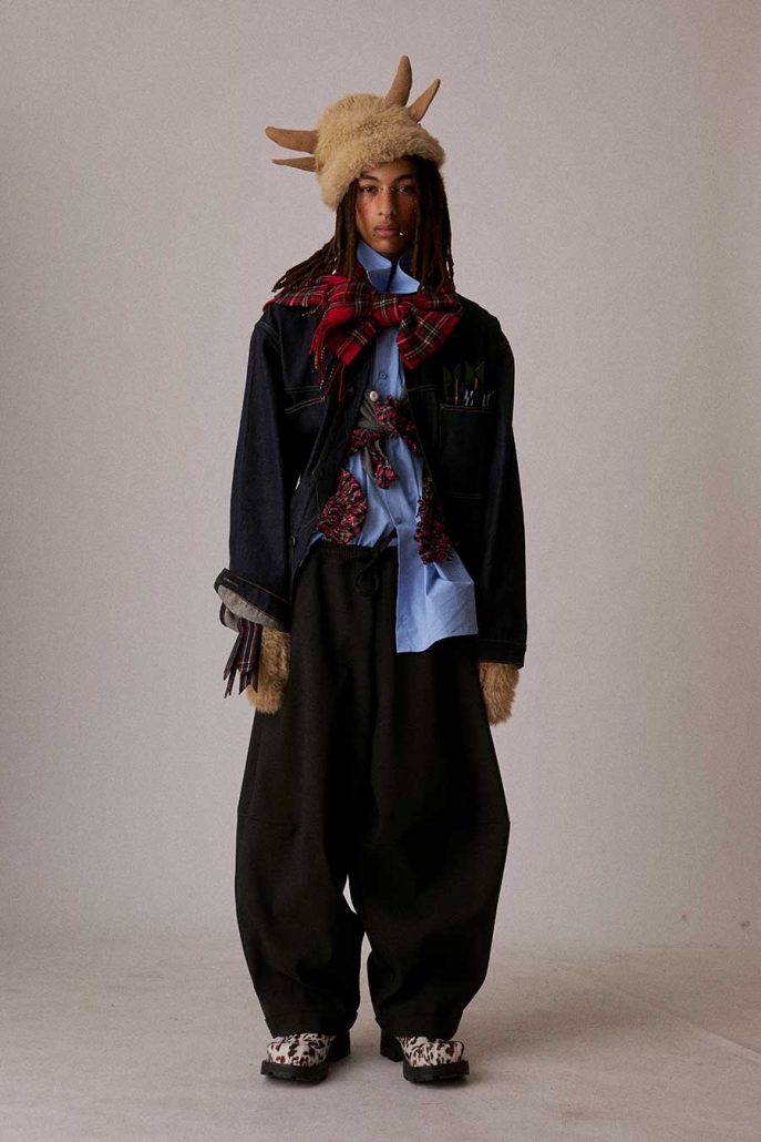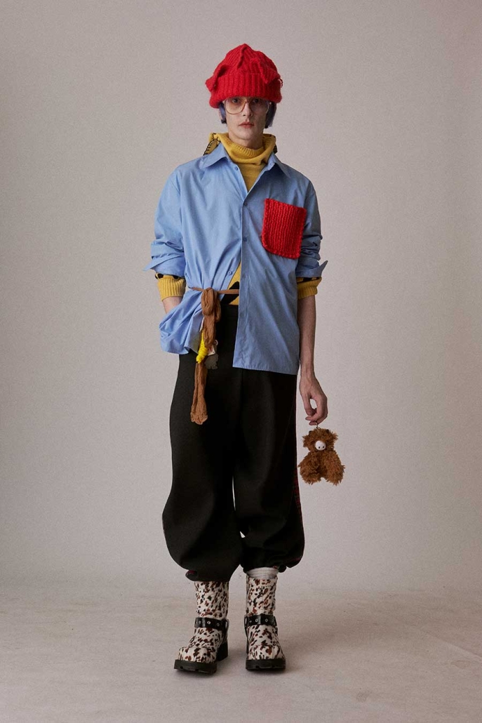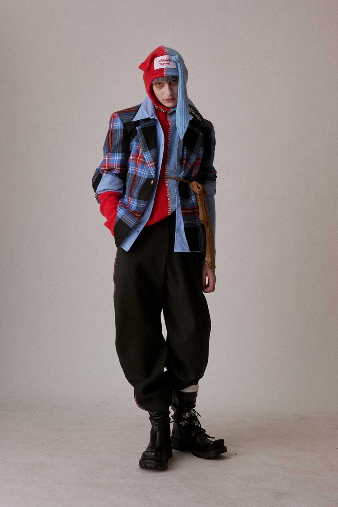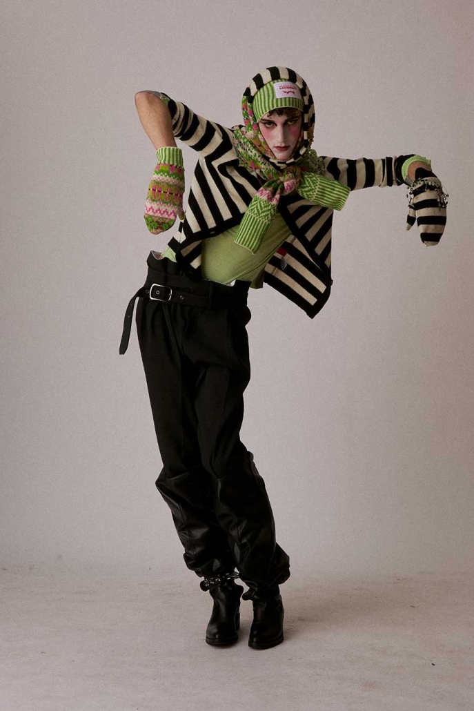 More ideas. Frankenstein turns tailor: oversized, spliced suits, where one jacket melds with another to create shapes you’ve never seen before, because what’s better than one jacket? That’s right, two jackets. Beanies are dissected and reassembled, half and half. We add sleeves to shirts and tie them around our hearts. We throw on a sweater. And a cardigan. And a scarf. Pull up tights, then socks, two pairs.