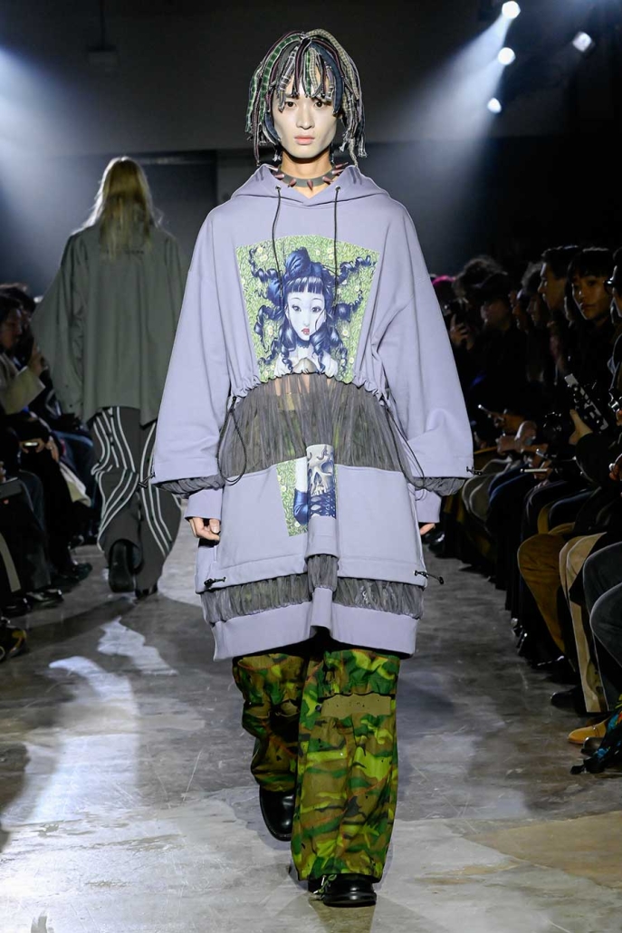 In the Fall/Winter 2026–27 collection, these tensions are distilled into individual garments. Smoky, muted color palettes are confronted with black silicone rubber distressing. A collaborative MA-1 with ALPHA INDUSTRIES wraps rigid military construction in soft tulle, softening the boundary between femininity and aggression. Artworks by Trevor Brown, an artist deeply rooted in Tokyo’s underground scene for over three decades, appear throughout the collection: oversized devil and angel wings that engulf the body, sharply curved mods coats, and layers of tulle cutting across graphic imagery of girls. Together, they give physical form to opposition.