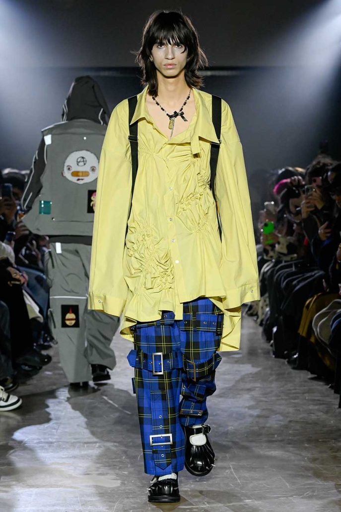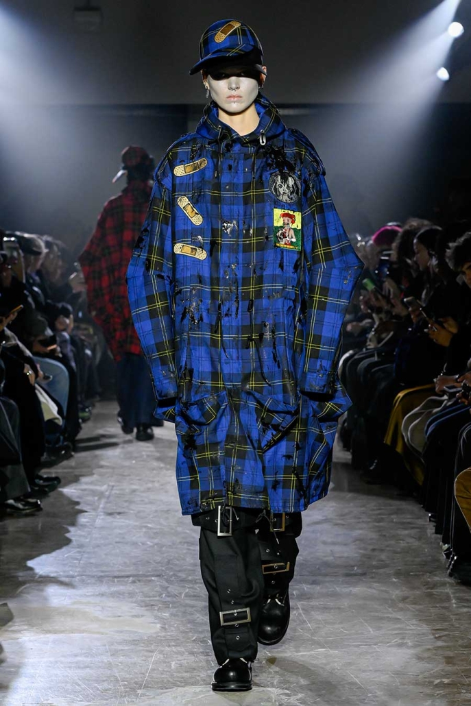 Cut-out fabrics, quilted skirts, traditional tartan checks, belt-bound bondage details, safety pins and metal embellish- ments, piping that traces the garments’ contours. Fabrics range from jacquard weaves to reflective materials. Punk symbols, intuitively understood by Sueyasu, are pushed to excess most notably in the UMBRO collaboration, where more than 40 adjustable points are embedded across panel transitions. At the same time, ongoing collaboration with teams skilled in bespoke tailoring allows technical refinement and rebellion to coexist.
