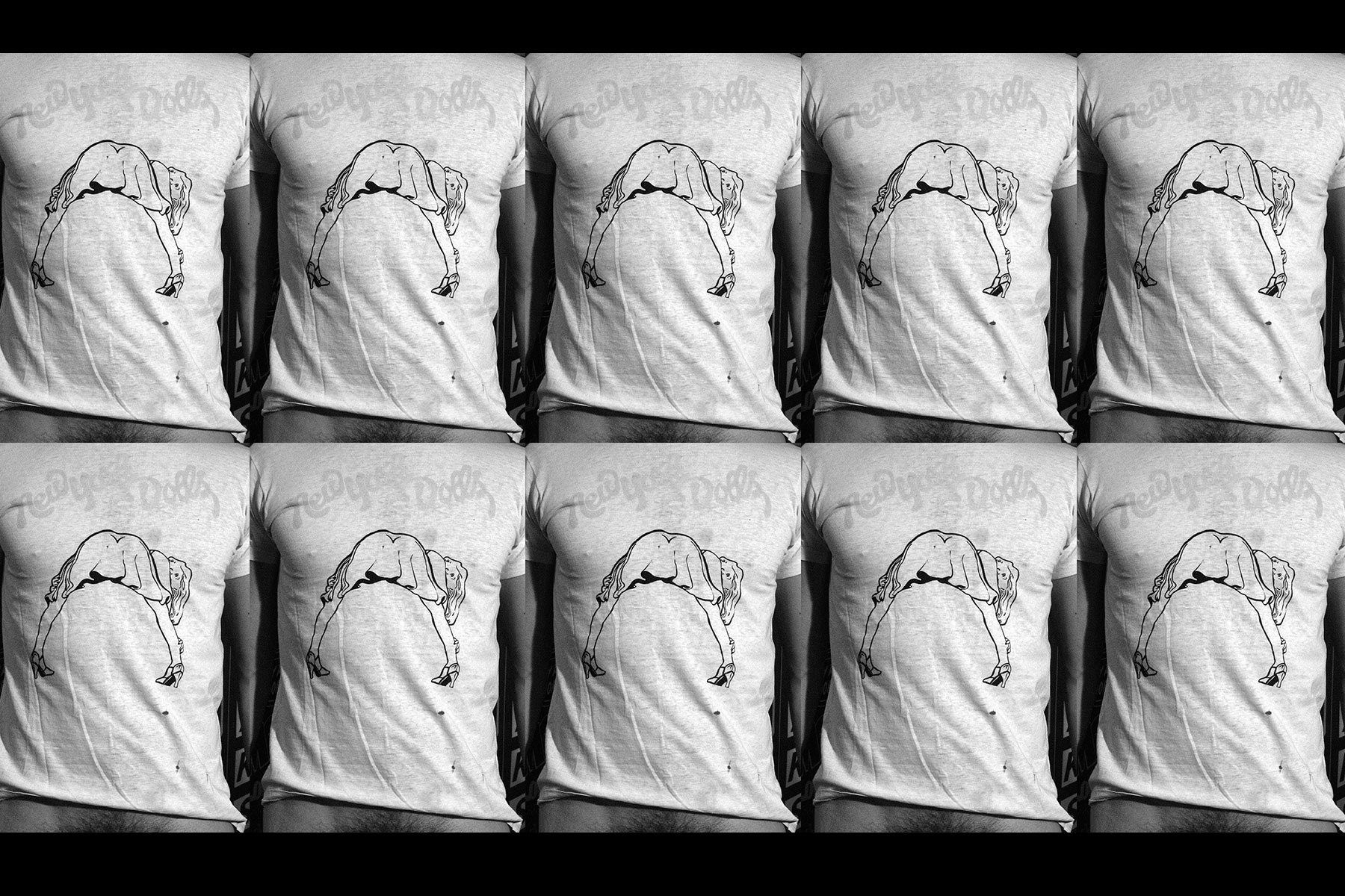 The images on the right are some of the sexiest t-shirts I own. I didn’t want them to look lifeless. I wanted them to be coming at you like you were being approached at a bar stool. Some of them have stories and all of them are originals. The New York Dolls shirt was originally owned by Jayne County. The Eagles Nest shirt, also from 1972, was worn by Oliver Rish. The Body shop shirt was a generous gift from Kitten Natividad. The Seka was purchased from Seka when I had the pleasure of meeting her in college. The Punk magazine shirt was a gift from director Charles Atlas. The Madam Adista originally belonged to muse Melody Rodgers. Both the Doctor X and BAD shirts were made famous by Debbie Harry. The Cheap Trick was my first concert shirt. The Lou Reed Transformer shirt is my all time favorite and original, and echoed in the Shake Her lounge shirt with a Tex Avery wolf. Fast Freddy and the Playboys were a 1970s male strip group that were so popular they had an LP and merchandise. The Invaders t-shirt is one of the oldest I own and is from an outlaw motorcycle gang.