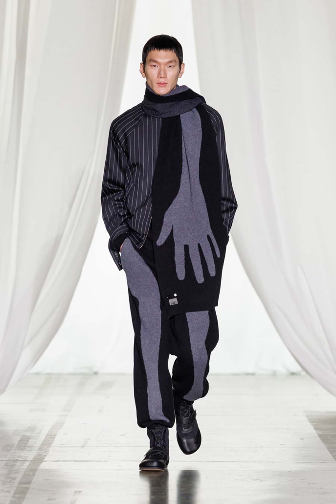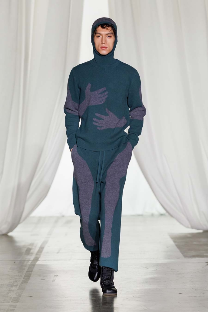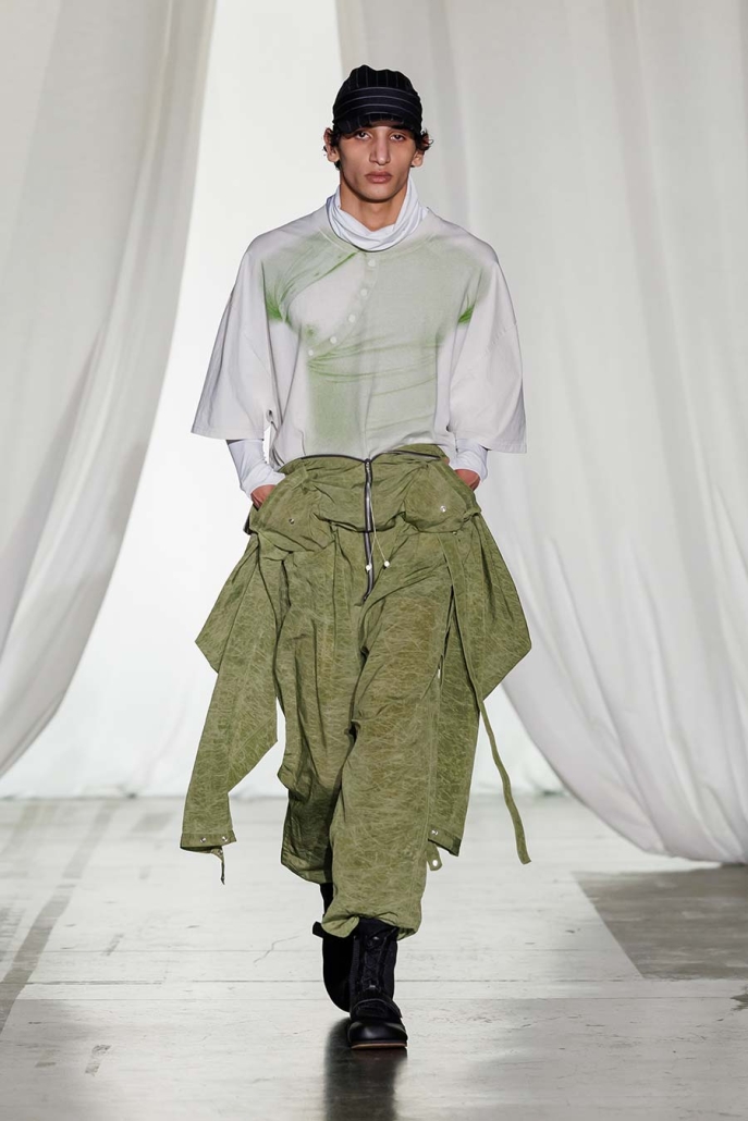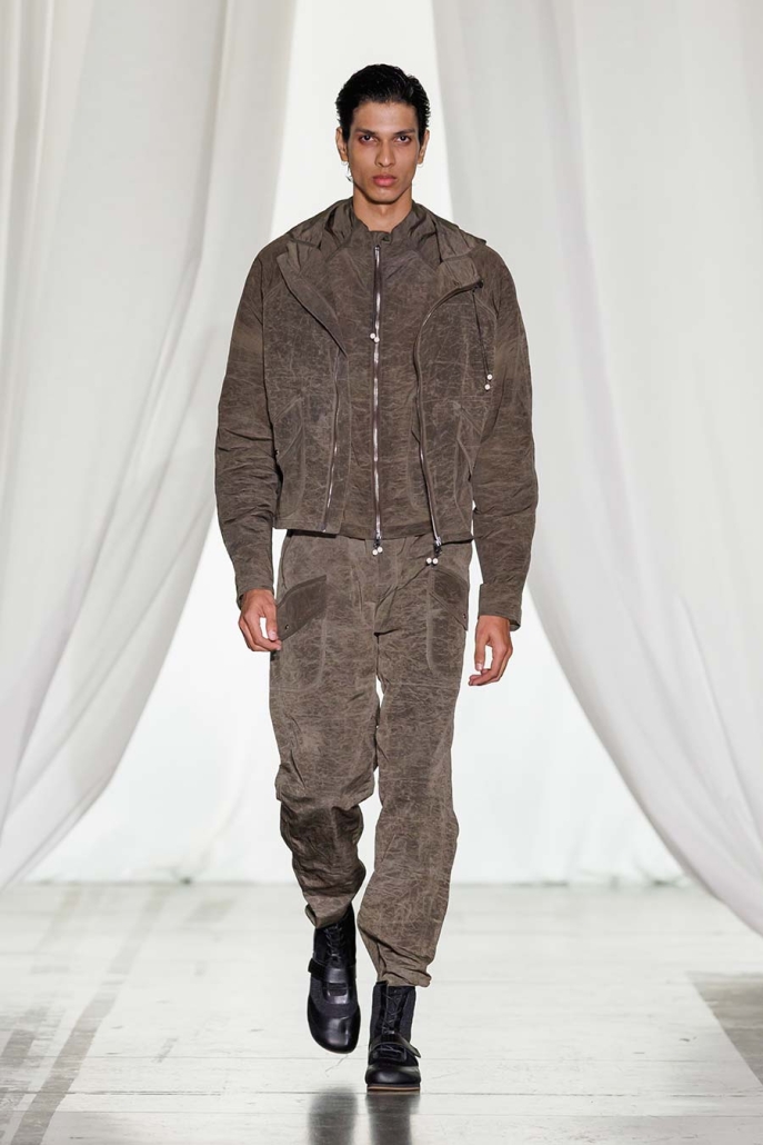 Reflecting on the “masks” we wear day-to-day, this season allows the wearer to masquerade as someone entirely different. Compression tops, printed with a hazy body motif, are equipped with a funnel neck that, when donned, appears as if you’re wearing the silhouette of another person. A similar technique is applied to an overdyed, raw denim twinset, which is lasered with a chiselled physique kissed by waves of fabric. The look nods to ancient statues of the male form.