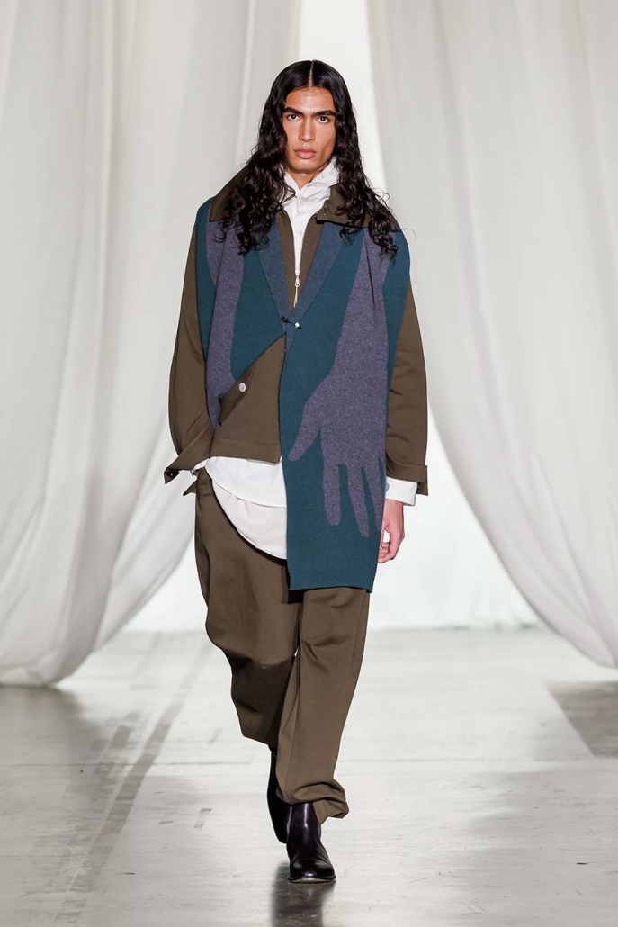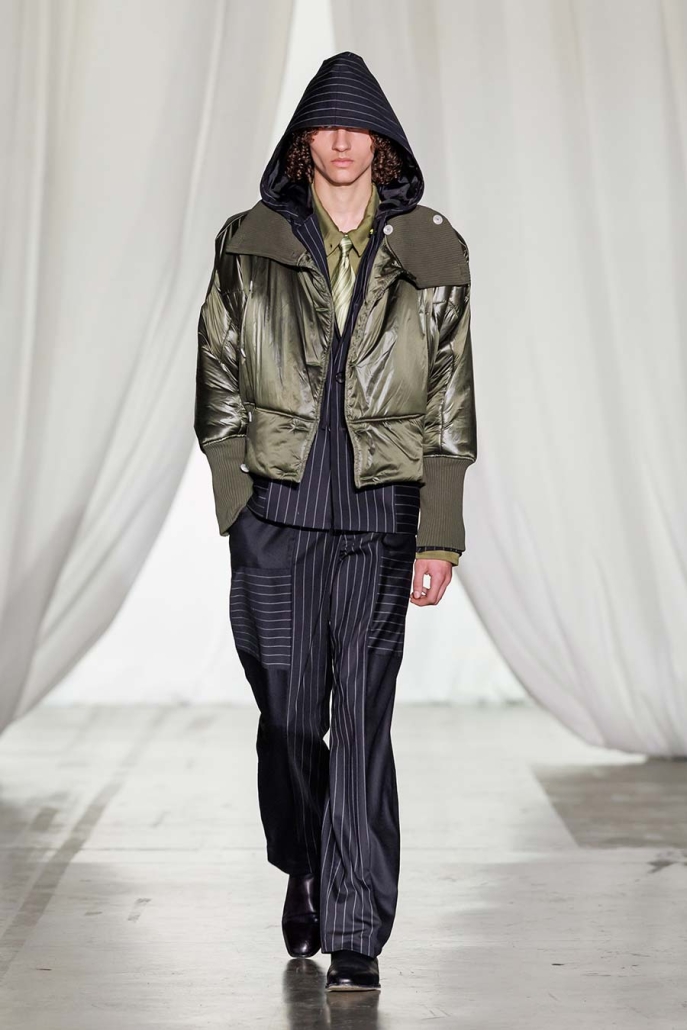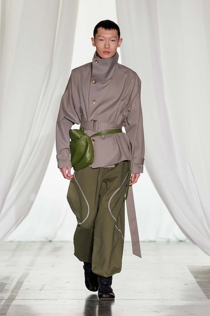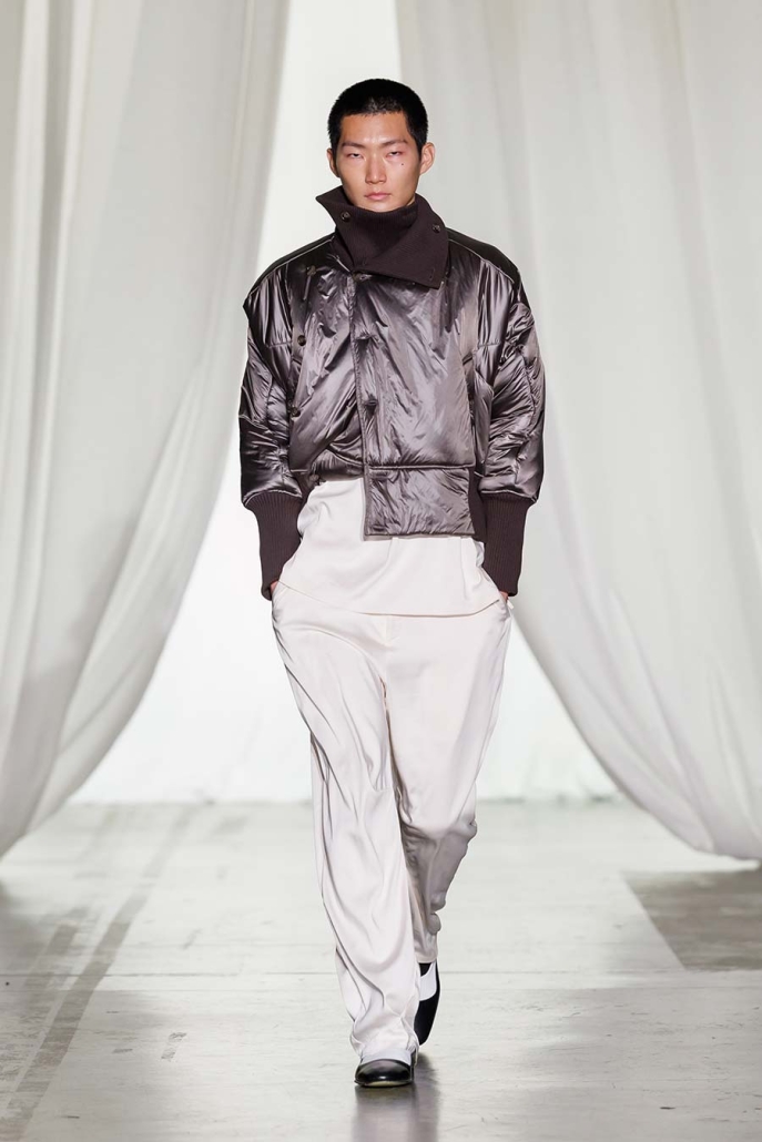 This toying of proportion extends into the brand’s most versatile outerwear offering to date. The collection includes military-inspired drill jackets with transformable collars that can be worn three different ways, cropped trench coats crafted using Nash’s kinetic cutting technique and padded jackets with elongated ribbed knit sleeves and exaggerated hemlines, which are ultra-lightweight thanks to their PRIMALOFT® Gold insulation.