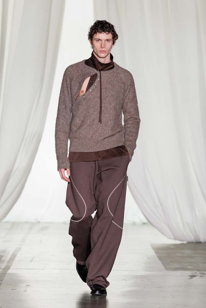 In a palette of greens, navys and earthy browns, the collection is a symphony of textures – where the silky sheen of utility trousers (cut from Viscose LENZINGTM) can be paired with crinkled recycled nylon zip-ups, or furry mohair blazers and nipple-exposing cardigans that come in a mix of alpaca and merino wool.