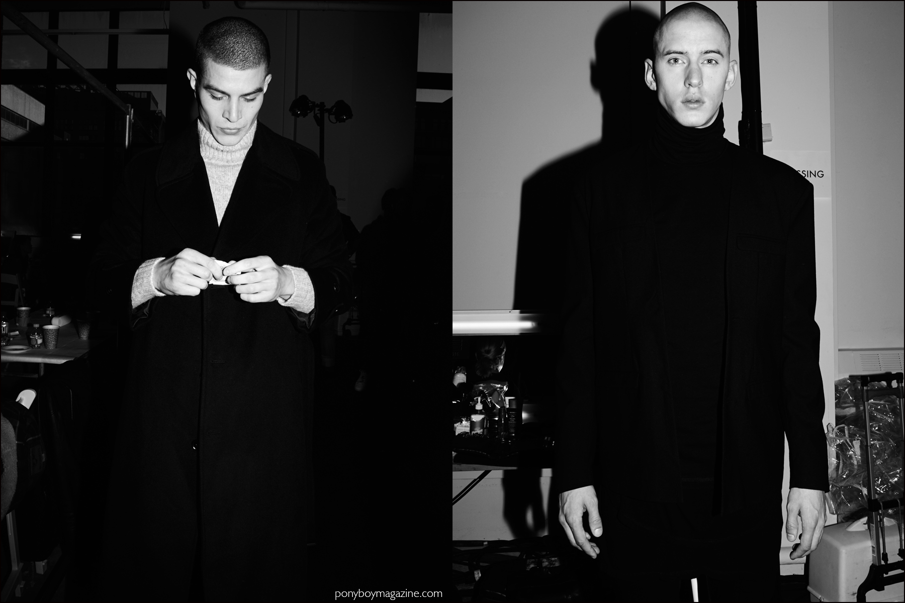 “New Soldier” was the name of the first-ever New York Fashion Week presentation by Los Angeles-based clothing label Stampd. Talented Creative Director Chris Stamp, who started the line back in 2011, has in a short time span collaborated with mega-brands including the Gap and Puma. The well sought-after Stampd is known for streetwear that is both luxurious and minimal. And the label stayed true to their mainly black and white palette this season. The twenty looks shown at the presentation were quite strong in their military inspiration. Our favorite looks included the bombers and M-65’s with straps, as well as the grey sweater with distressed elbows. But perhaps the best look was on model Ian Weglarz – a black trench coat with a high collar, shoulder flap and dramatic back straps. This uniform, minimal way of dressing has always been a favorite of ours. Stampd has clearly made its stamp on modern menswear. Photography Alexander Thompson. http://www.stampd.com